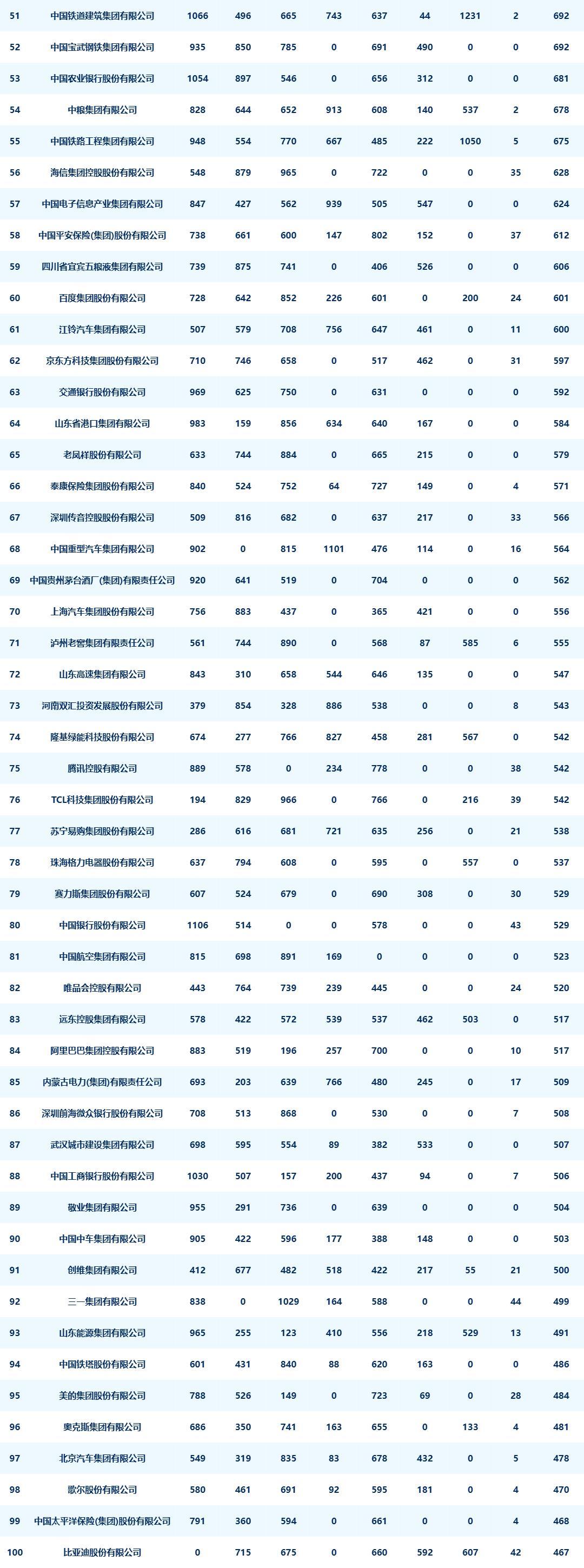 2025年三季度獲得中國企業新媒體指數前10名的企業分別是:中國移動通信集團有限公司、中國電信集團有限公司、中國聯合網絡通信集團有限公司、中國石油化工集團有限公司、中國能源建設集團有限公司、國家電網有限公司、中國石油天然氣集團有限公司、中國郵政集團有限公司、中國核工業集團有限公司、鞍鋼集團有限公司