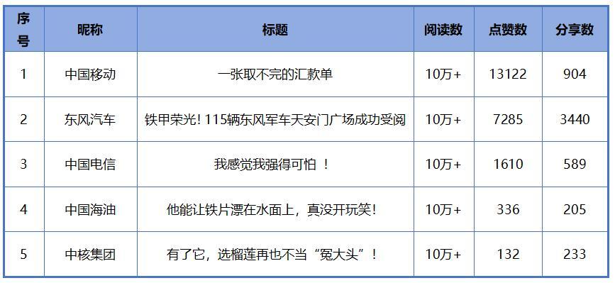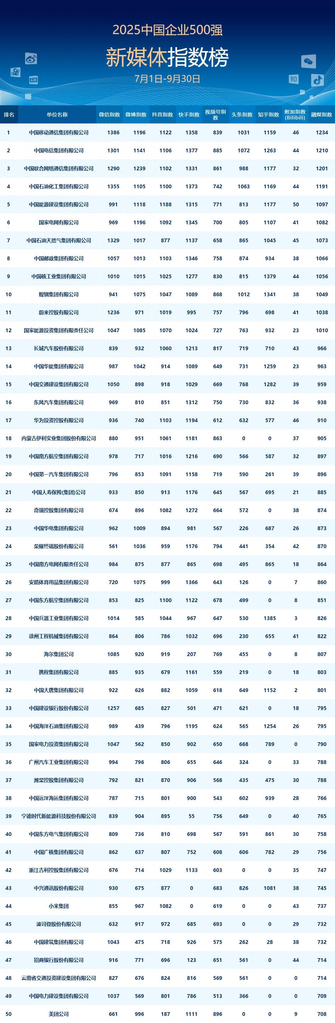 2025年三季度中央企業新媒體指數中,中國移動通信集團有限公司、中國電信集團有限公司、中國聯合網絡通信集團有限公司、中國石油化工集團有限公司、中國能源建設集團有限公司、國家電網有限公司、中國石油天然氣集團有限公司、中國核工業集團有限公司、中國航空工業集團有限公司、鞍鋼集團有限公司分列前十。