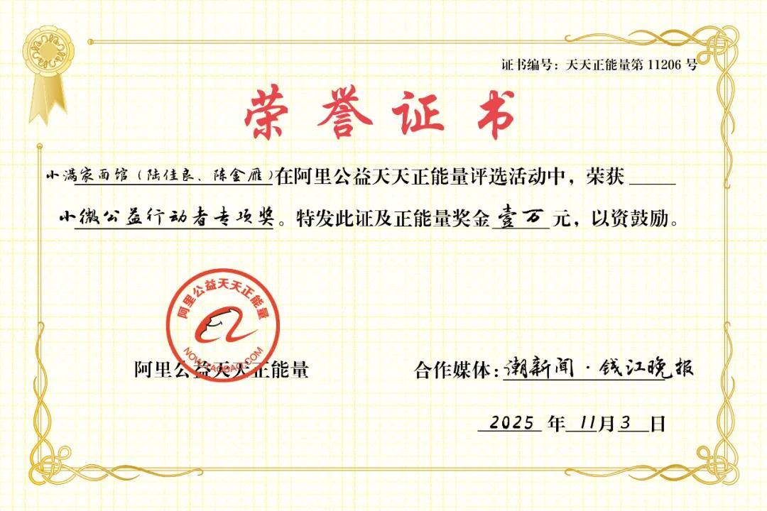 阿里公益天天正能量決定聯合潮新聞,爲陸佳良、陳金雁夫婦頒發小微公益行動者專項獎及萬元公益金。