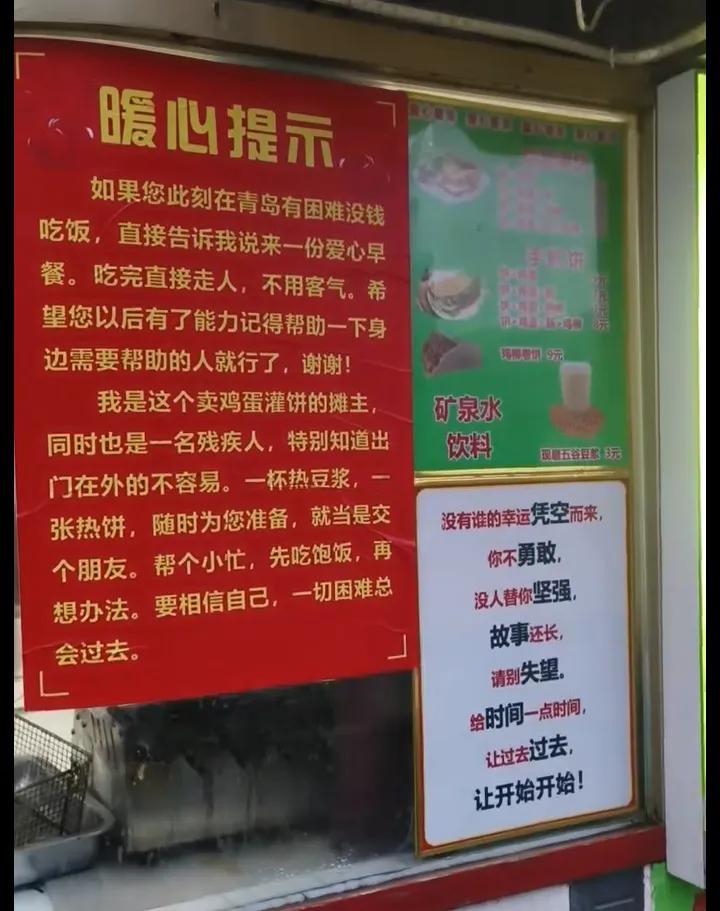 他的餐車可爲困難人士免費提供一份餐食,不問緣由,不問出處。賣給工地工人的雞蛋灌餅永遠便宜一塊錢,因爲他們賺錢極爲不易。
