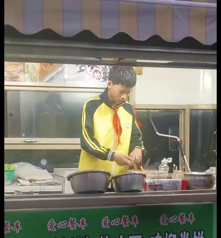 凌晨4點多,山東青島某工地旁一輛餐車裏,男孩嫺熟地幫父親敲雞蛋、打豆漿、撐袋子。當時一年級的他剛和桌子一邊高,卻儼然一個小大人,備菜、打包、招呼顧客,樣樣能做。撤攤後,他才背上書包獨自走進校園。