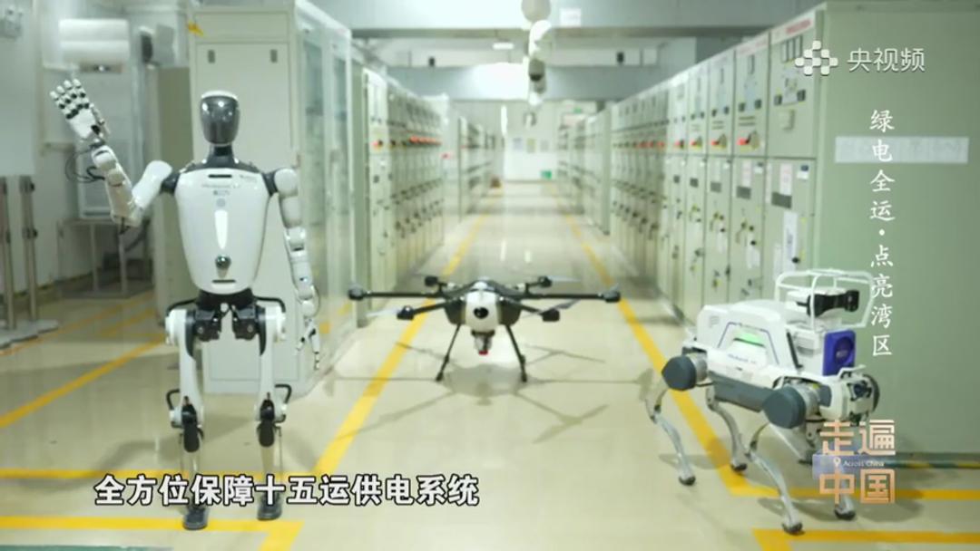 這支AI戰隊由機器狗、無人機和具身智能機器人組成,能“上天入地”。其中的機器狗,搭載了雙目雲臺,能夠幫助人員對設備的狀態進行監測,及時發現設備缺陷等異常情況,憑藉四足結構,輕鬆穿越臺階及一些狹窄的複雜地形;它還連接了變電站的周界監控,可以對特定區域邊界進行實時監測和預警,幫助構建變電站的立體防護。