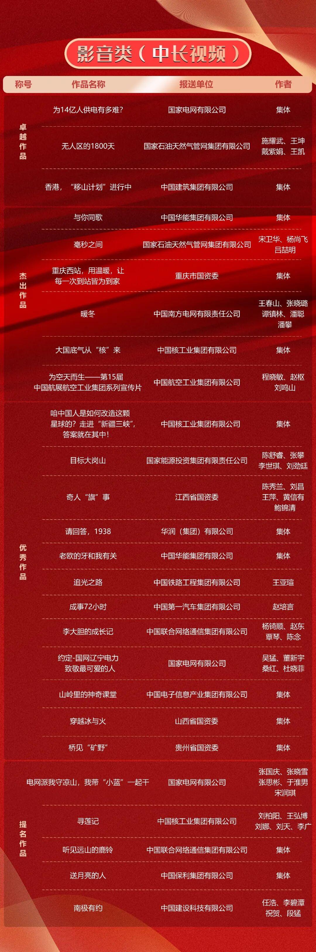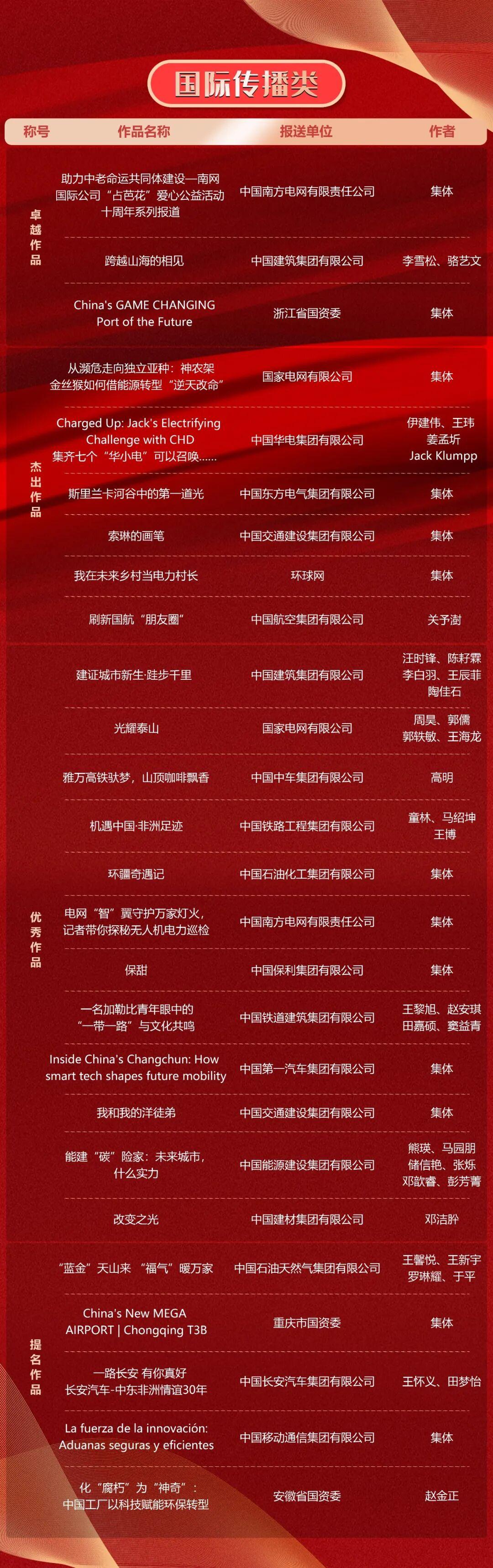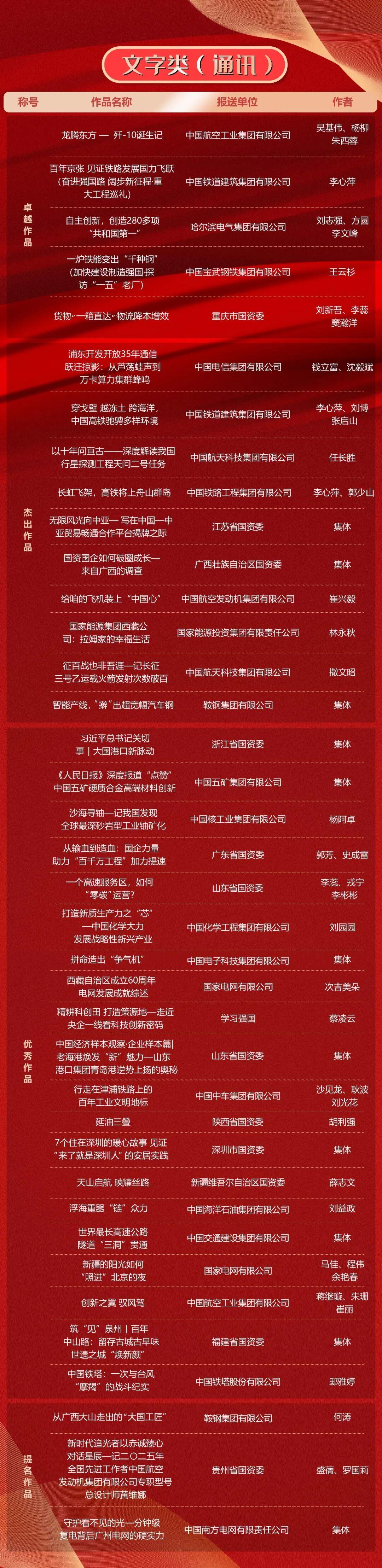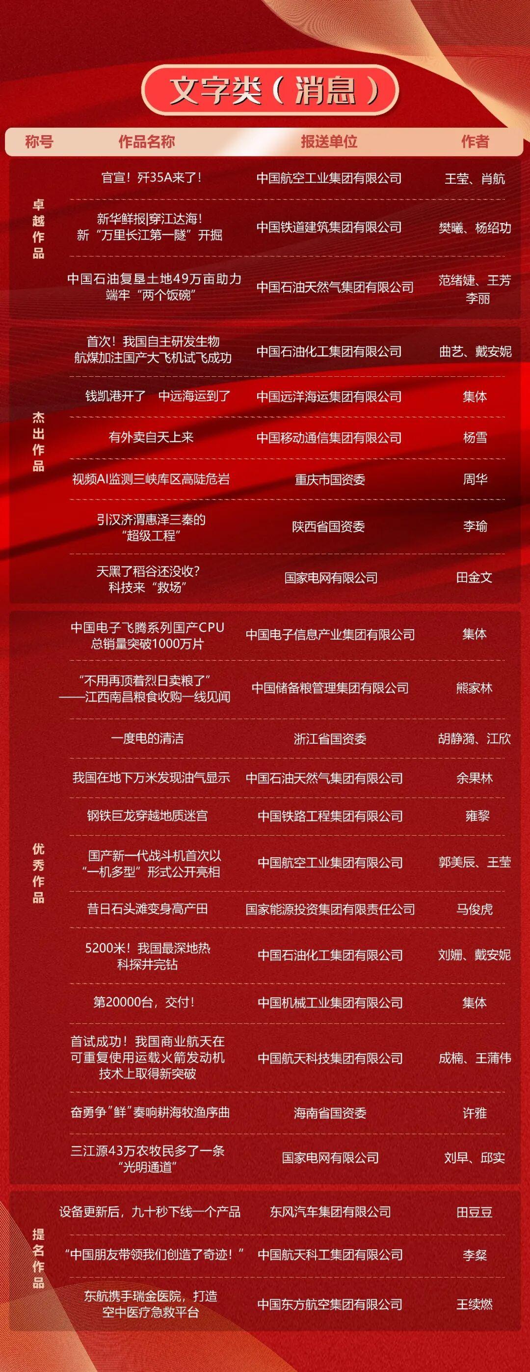第十一屆“國企好新聞”推介作品於11月21日揭曉。本次“國企好新聞”由國務院國資委宣傳局、中國記協國內部指導,國務院國資委新聞中心主辦,《國資報告》雜誌社承辦。經初審、複審、終審、公示,共有文字、融媒體、影音、國際傳播、人工智能(AI輔助作品)5類255件作品榜上有名。