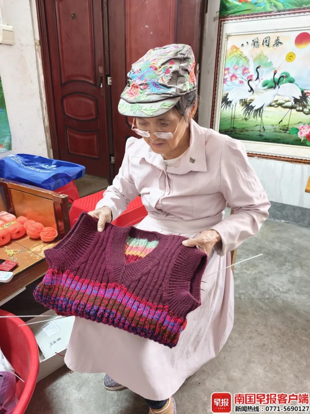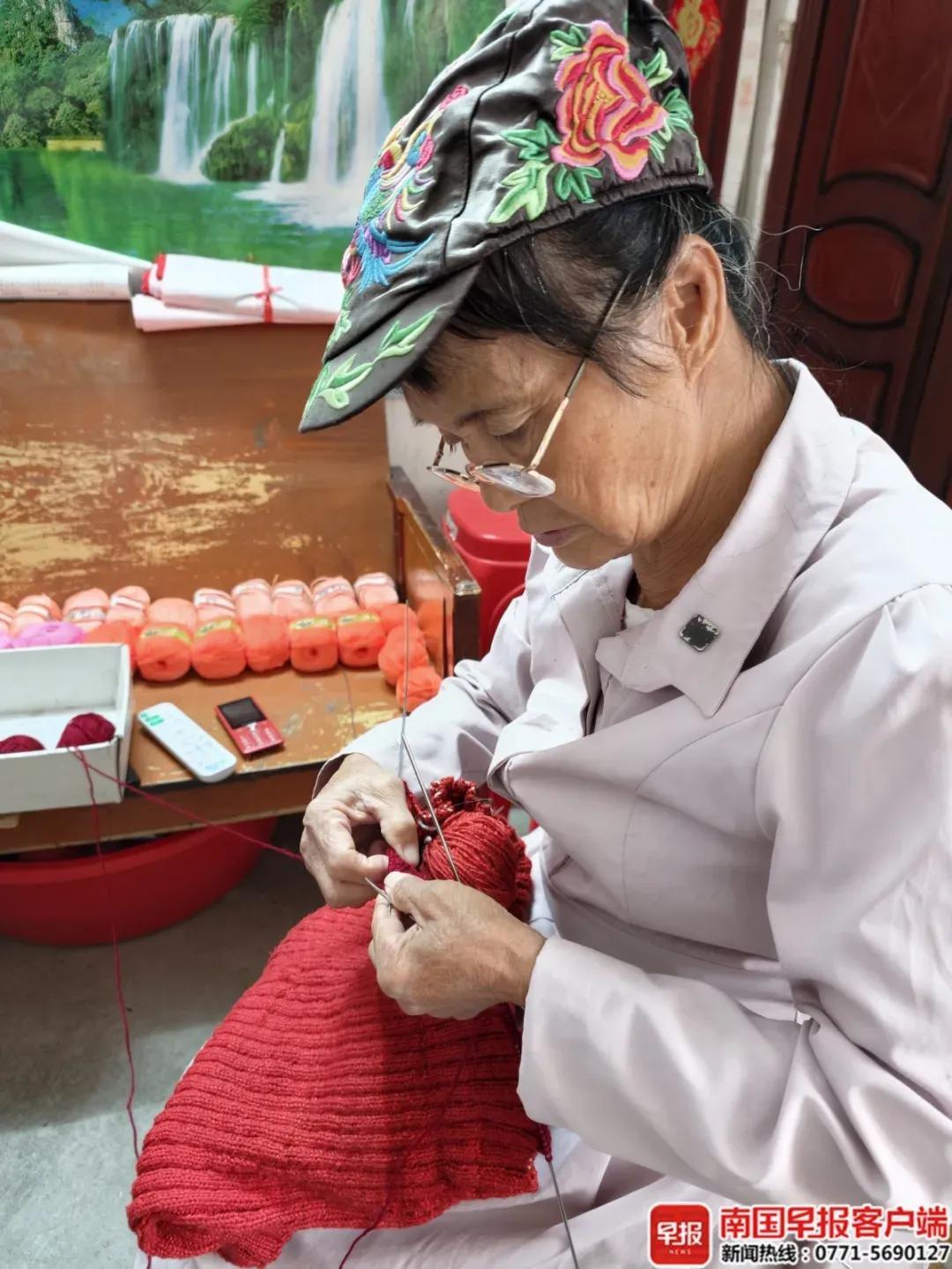 1954年出生的鐘球珍是賀州人,5歲時腿腳開始出現不便,隨着年齡的增長,現在的出行都得依靠輪椅和柺杖。年輕時鐘球珍擺攤賣水果,織毛衣的手藝就是那時邊做生意邊練出來的。
