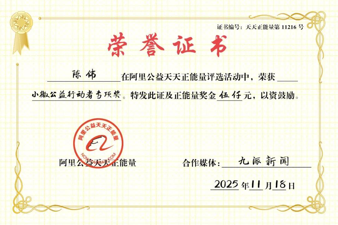 阿里公益天天正能量聯合九派新聞,爲陳偉頒發小微公益行動者專項獎及5000元獎金。