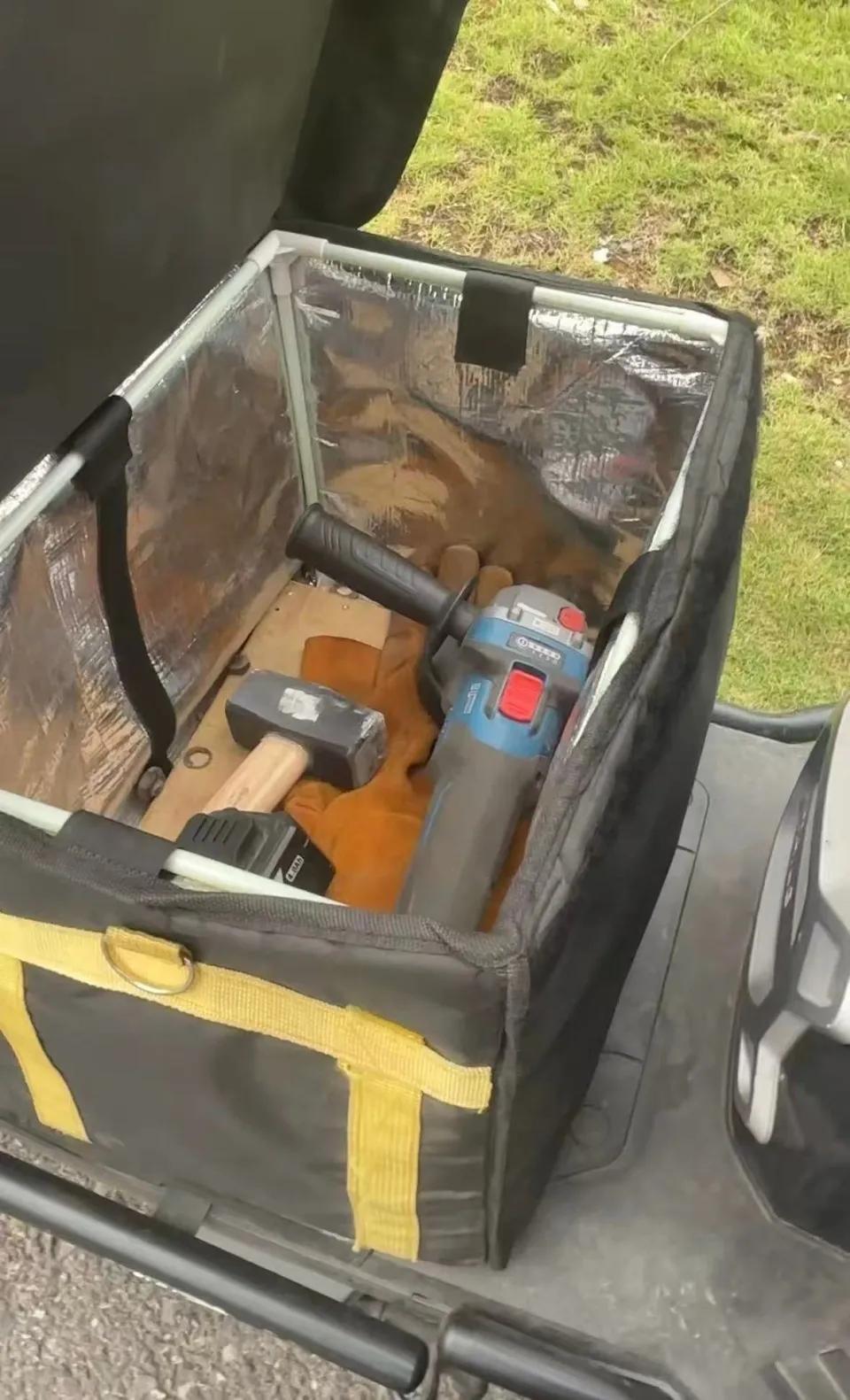 “寧願火花濺到自己,也不能讓行人、車輛傷。”外賣員陳偉展示着自制的防護板,還有工具箱裏20多種工具:兩塊廢品站討來的木板、兩瓶滅火器、急救包、打氣筒……