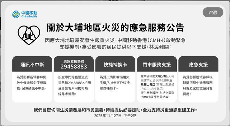 爲方便受影響居民與家人保持聯絡,中國移動迅速向火災周邊的大埔營業廳和馬鞍山營業廳調配780臺充電寶、4000張儲值卡、應急電話等應急物資;設立綠色通道服務熱線,向大埔地區受影響的客戶推出豁免通信及快捷辦理補換卡等服務,迅速響應客戶需求。