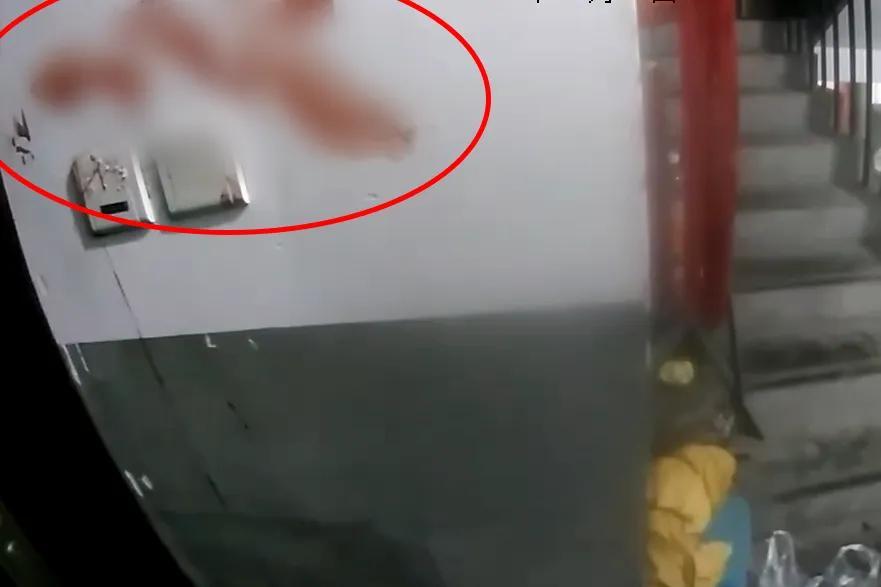 可走到三樓,發現旁邊的白牆上也有紅色的手掌印,有點像血跡,再往前走一點,發現三樓一戶人家門口還有一大攤血。
