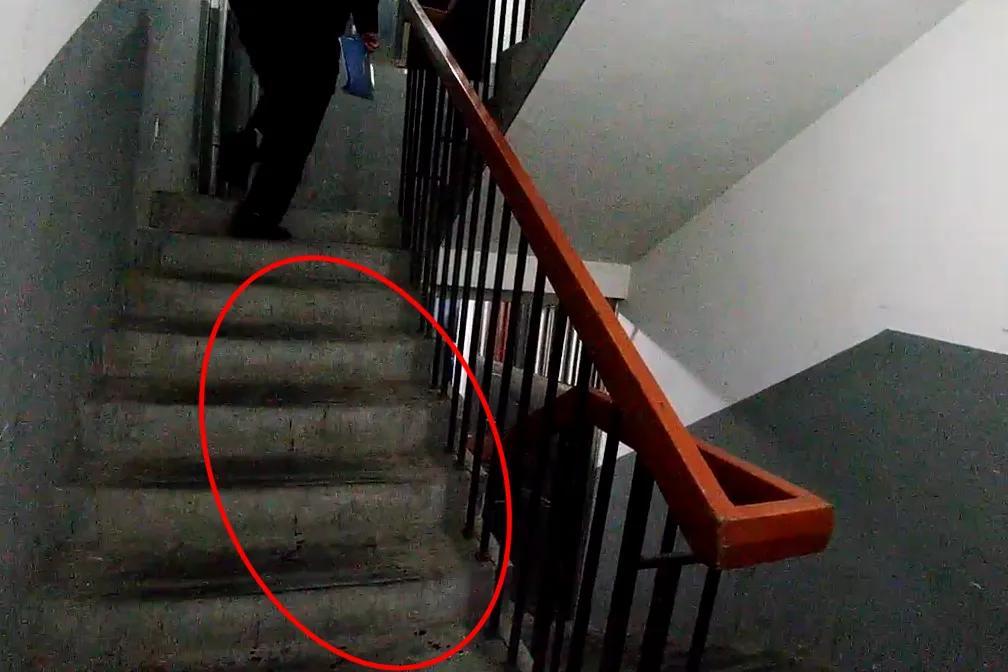 事情發生在11月18日凌晨2點多。他下夜班回家,剛走進單元樓,就看見樓梯臺階上有很多連續點滴狀的紅色液體。