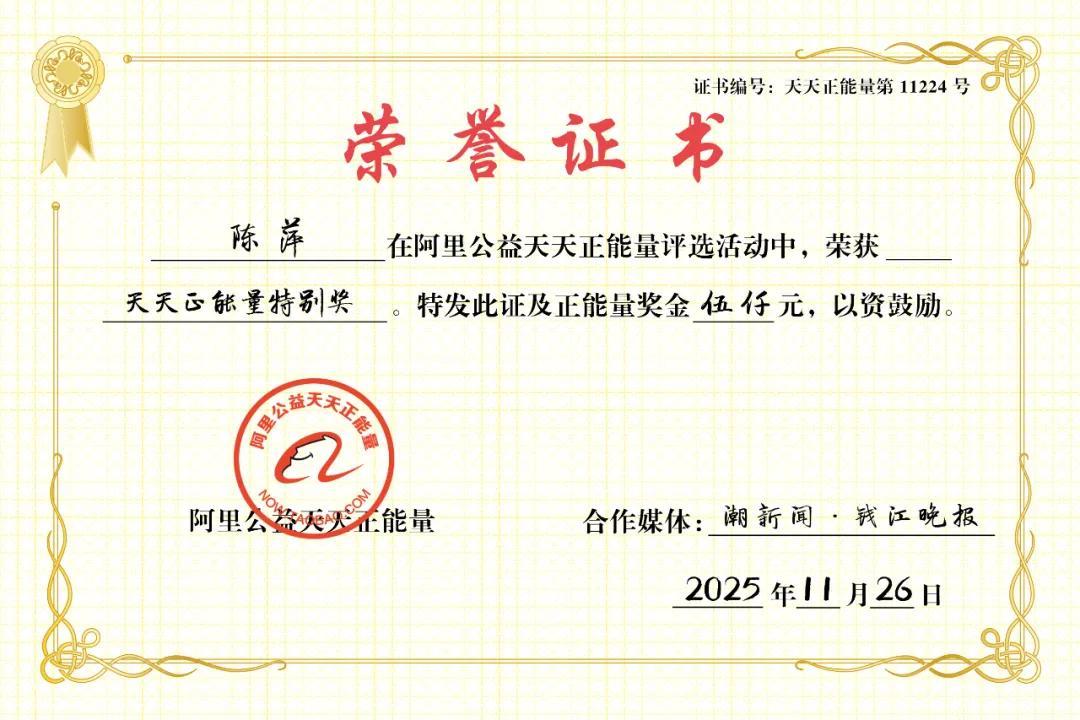 阿里公益天天正能量聯合潮新聞·錢江晚報,爲陳萍頒發正能量特別獎5000元。