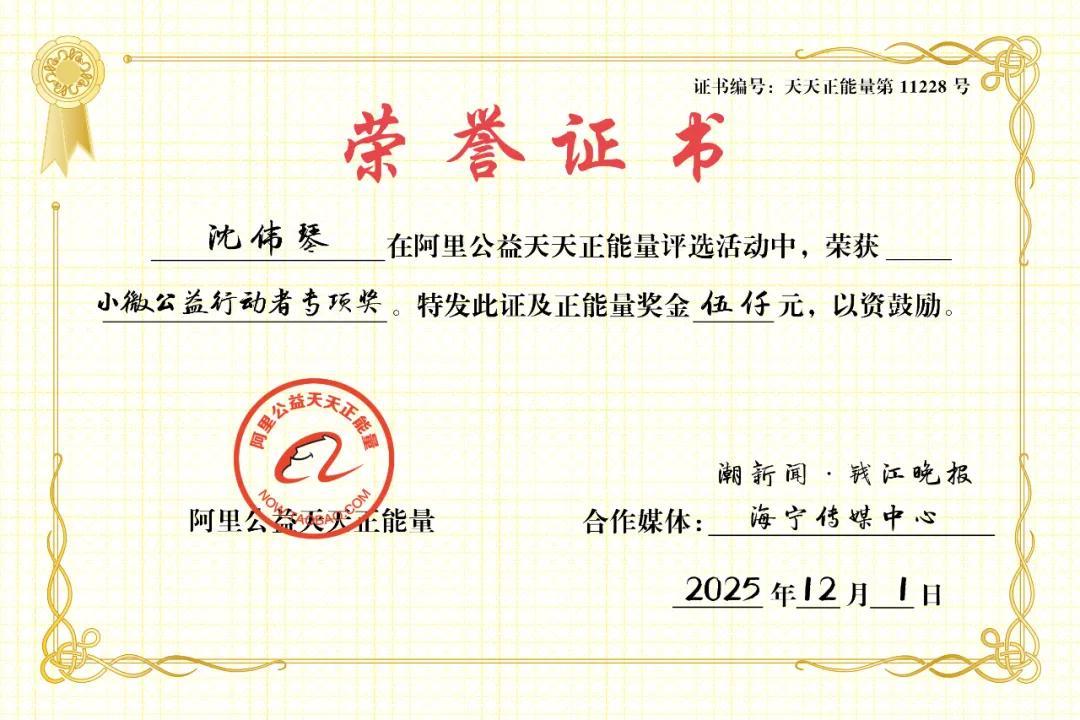 阿里公益天天正能量聯合潮新聞·錢江晚報、海寧傳媒中心,爲沈偉琴頒發小微公益行動者專項獎及獎金5000元。