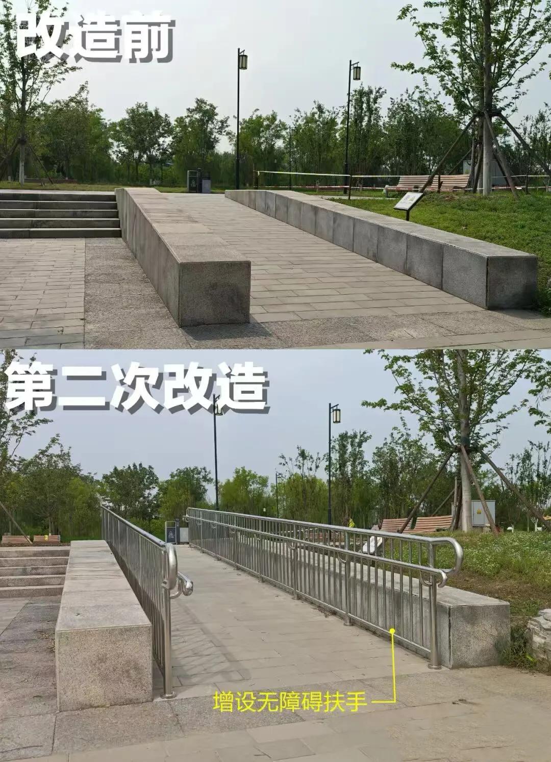張屹還發現,天壇公園售票處的無障礙坡路通道有點小問題——坡道與休息平臺的扶手未保持連貫。