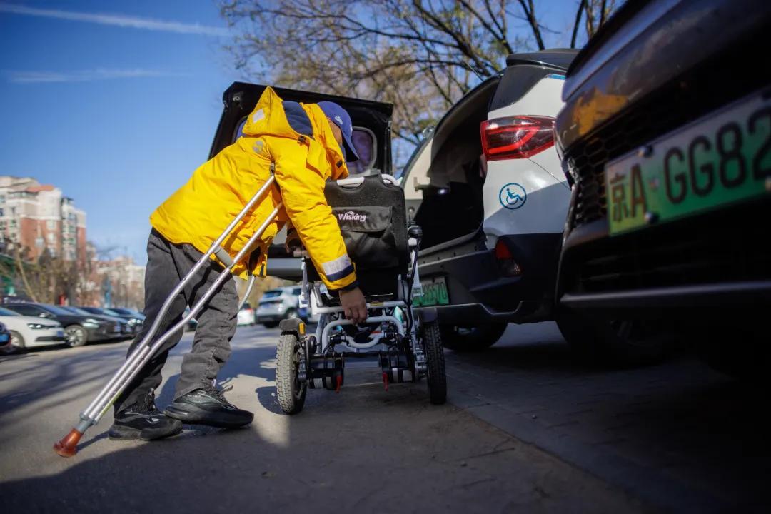 張屹將電動輪椅放進車的後備廂準備出發,車輛後部張貼了無障礙標識