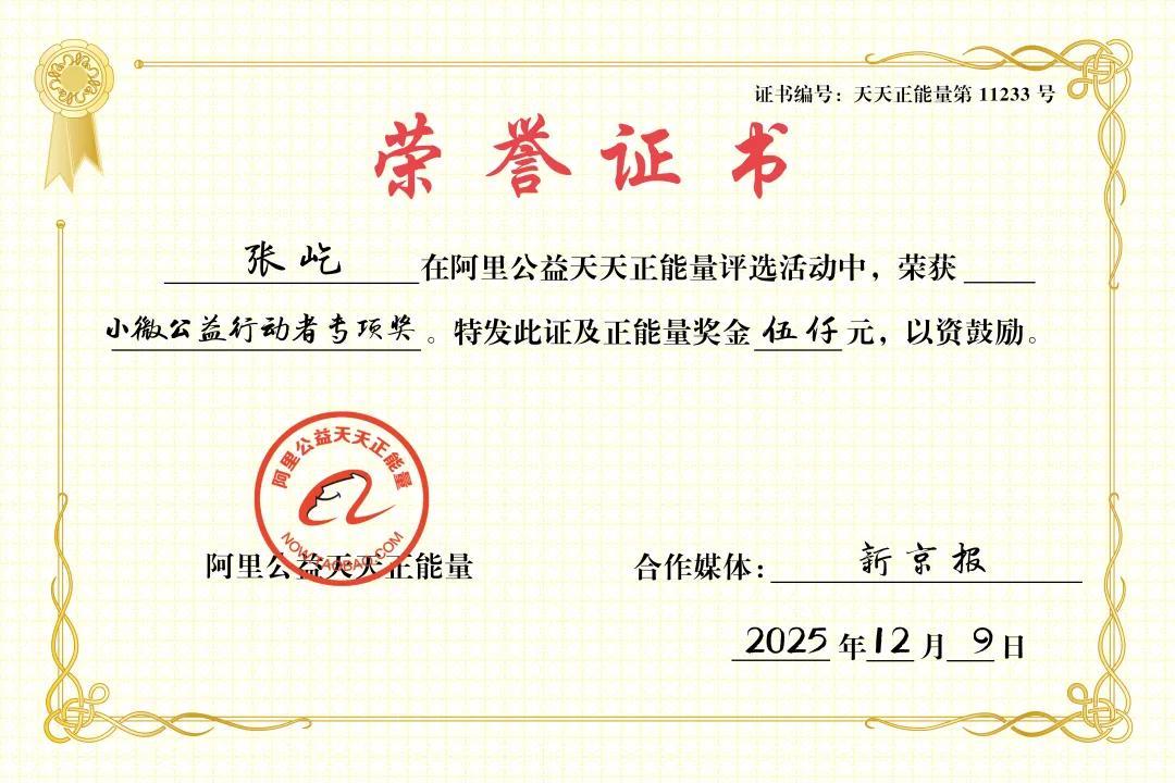 阿里公益天天正能量聯合新京報,爲他頒發小微公益行動者專項獎及獎金5000元。
