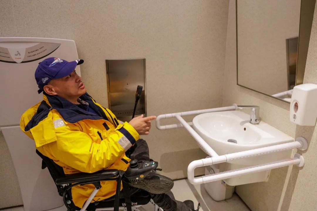 張屹還體驗了通州萬象匯頂層電影院的無障礙廁所,該廁所並未設置有設計規範要求的多功能臺和低位掛衣鉤,這會給殘障人士解決生理問題時帶來困難。