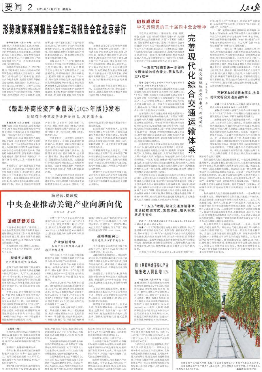 以新求變,新興產業發展勢頭強勁。115家啓航企業加快打造創新型企業,未來產業438項技術攻關取得積極進展。應用人工智能技術,產業轉型升級深入推進。今年以來,中央企業有力實施“人工智能+”專項行動,累計佈局應用場景超過800個,數字化轉型行動打造智能工廠1854個。
