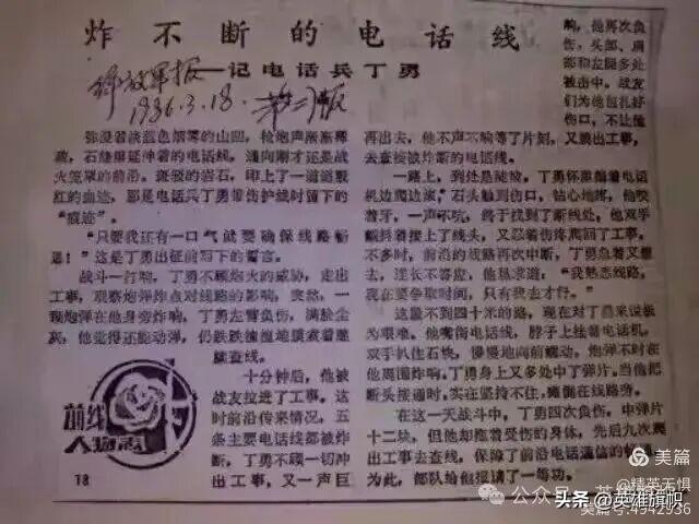 上圖:《解放軍報》1986年3月18日刊登《炸不斷的電話線——記電話兵丁勇》。