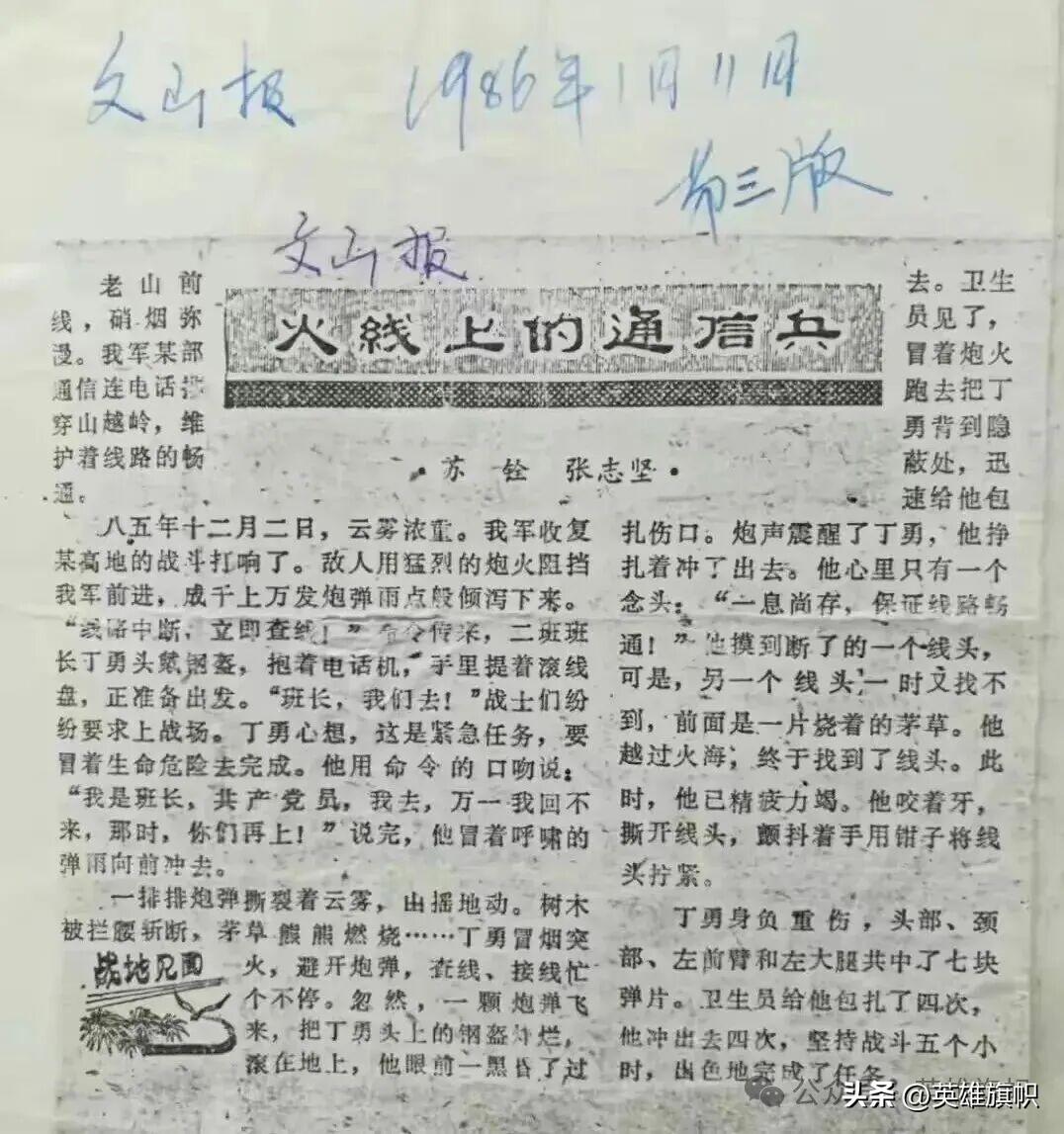 上圖:《文山報》1986年1月11日,刊登了《火線上的通訊兵》報道了丁勇和戰友們的事蹟。