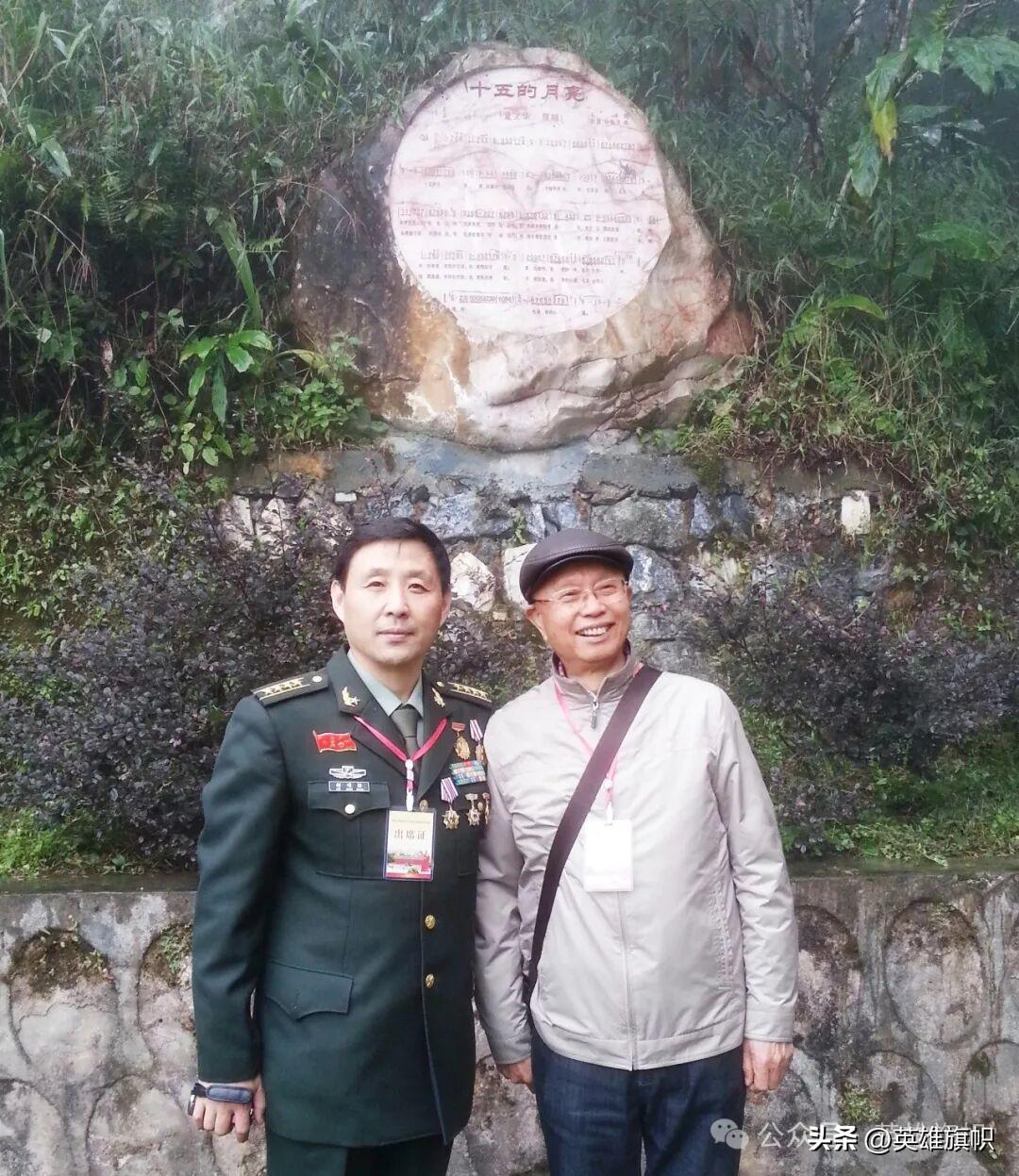 上圖:2014年11月,胡國橋與鐵源參加“老山英雄老山行”活動,在老山主峯《十五的月亮》歌曲石刻前合影。