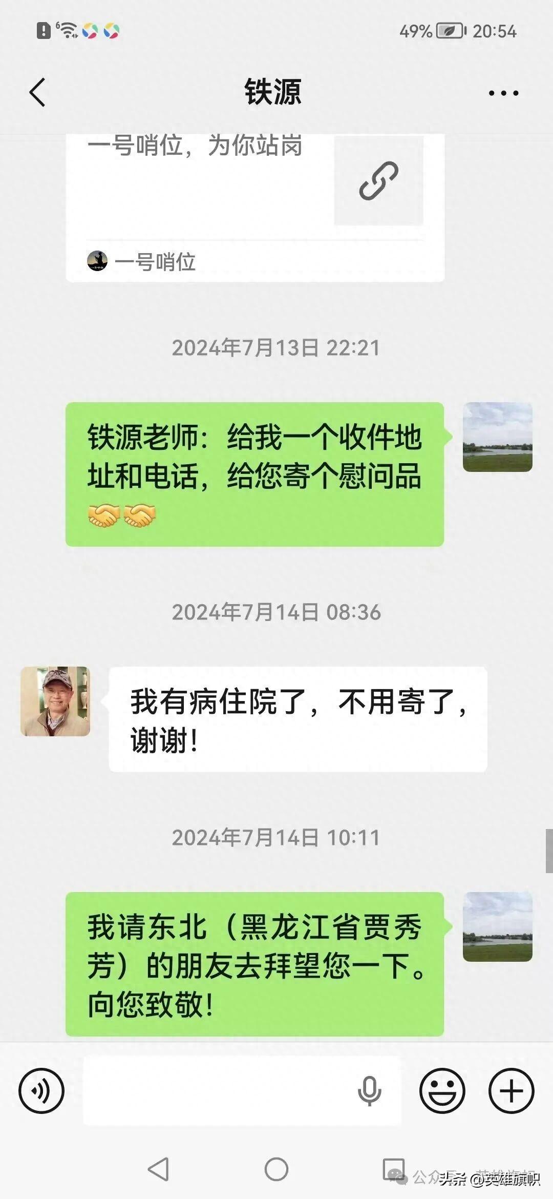 我打開鐵源的微信,我們的通信停留在2024年7月14日。當時,“英雄,您好!”致敬老兵慰問活動小組要給他寄慰問品,鐵源老師回信說:“我有病住院了,不用寄了。謝謝!”