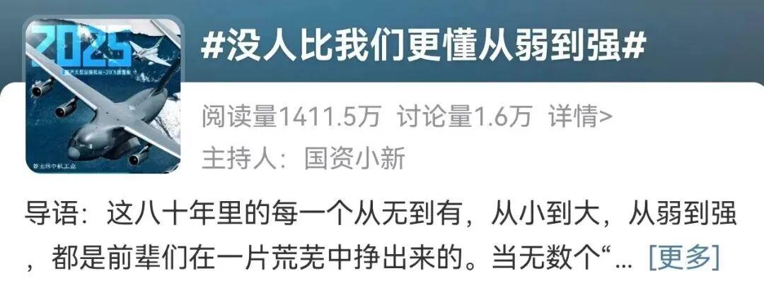八十年前,硝煙初散,瘡痍滿目。從炮火裏走出來的那一代人,面對造不出飛機導彈的窘迫、洋油洋釘都要“仰人鼻息”的苦澀,咬住了牙,挺直了腰。一羣人,又一羣人站了出來。他們用雙手和汗水,在廢墟之上,在荒漠之中,一寸一寸重塑山河。這八十年裏的每一個從無到有,從小到大,從弱到強,都是前輩們在一片荒蕪中掙出來的。其中的苦與甘,我們銘記於心,代代相傳。