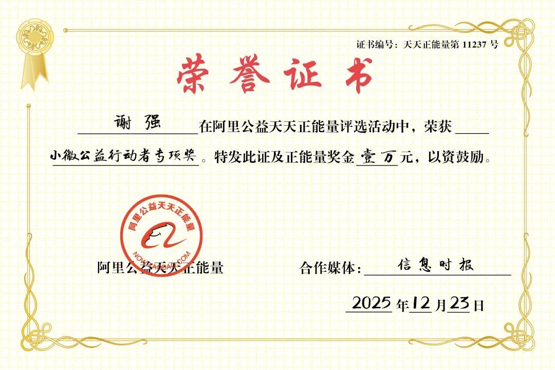 阿里公益天天正能量聯合信息時報,爲謝強頒發小微公益行動者專項獎及激勵金10000元。