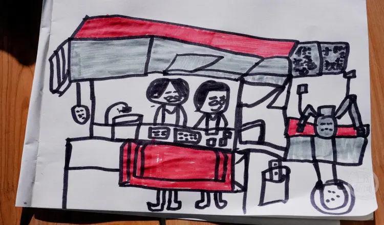 俊宏用水彩筆畫了一幅畫:那是小喫攤前的爸爸和奶奶。紅色的小三輪長上了翅膀,載着他愛的家人們,飛向那個遙遠又真實的心願。