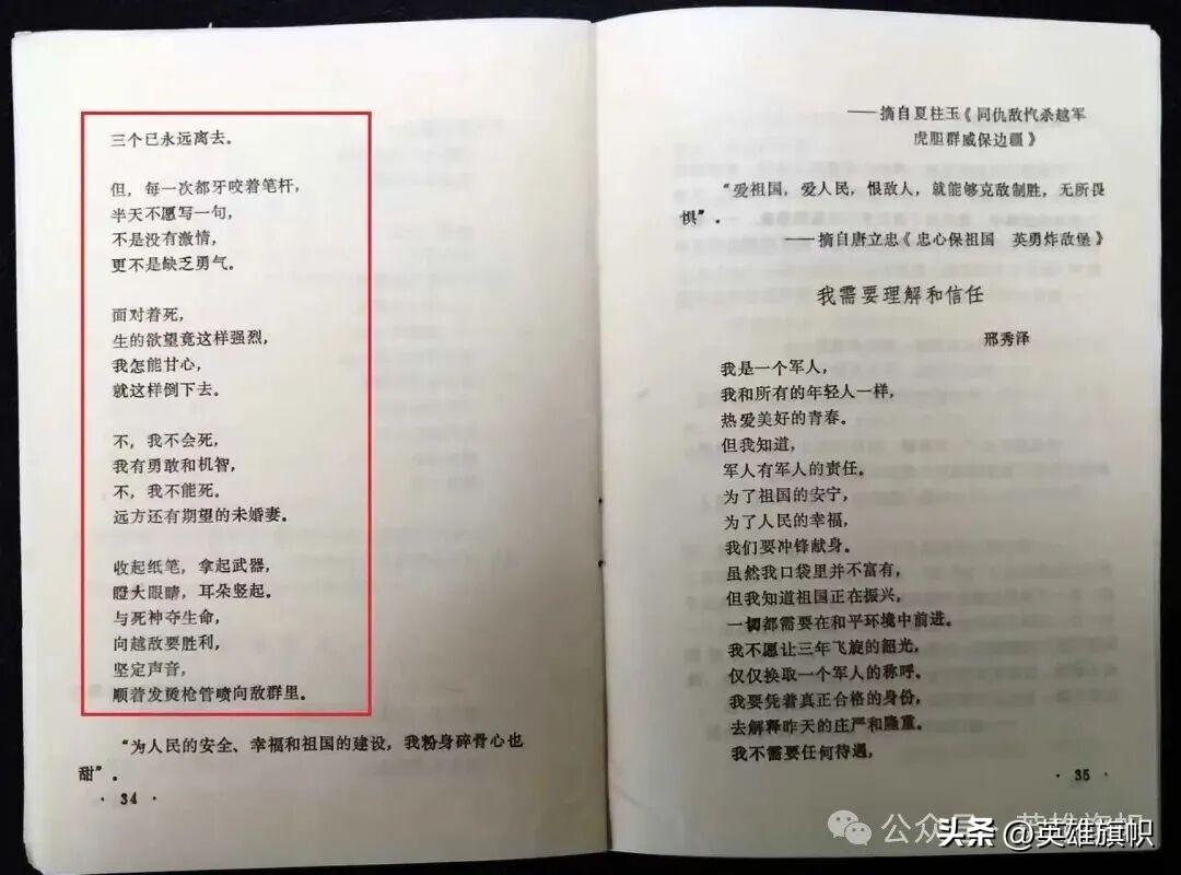 此外,在博物館印發的“展覽資料選編”中,還收入了我院學員胡國橋的陣地詩《不,我不會死》、邢秀澤的詩《我需要理解和死亡》、董疆勇的詩《無題》、劉靜給胡國橋的信(摘錄)、胡國橋的母親李荷存給胡國橋的信(摘錄)。在幾所院校的展品中,我院是較多的,並陳列在院校展區的最前邊。