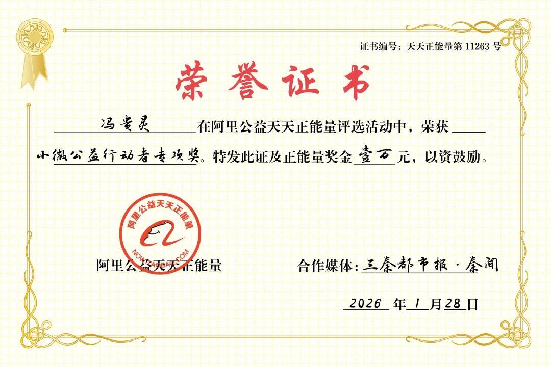 阿里公益天天正能量聯合三秦都市報·秦聞,爲馮貴靈頒發小微公益行動者專項獎,向行動者、堅守者致敬!