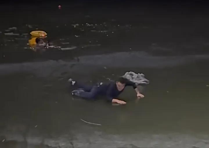 抵達現場時,兩名落水男子正在冰水中掙扎,其中一人已失去意識、身體不斷下沉,岸上傳來的嘶喊聲揪緊了所有人的心。