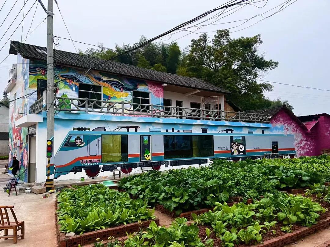 《浪漫桃花江號》是其中的代表作。在桃花江鎮楊家坳村,她們在長達數十米的牆面上,結合着牆體凹凸不平的走勢和門窗的佈局,畫出了漫天桃花中開出的特快專列。