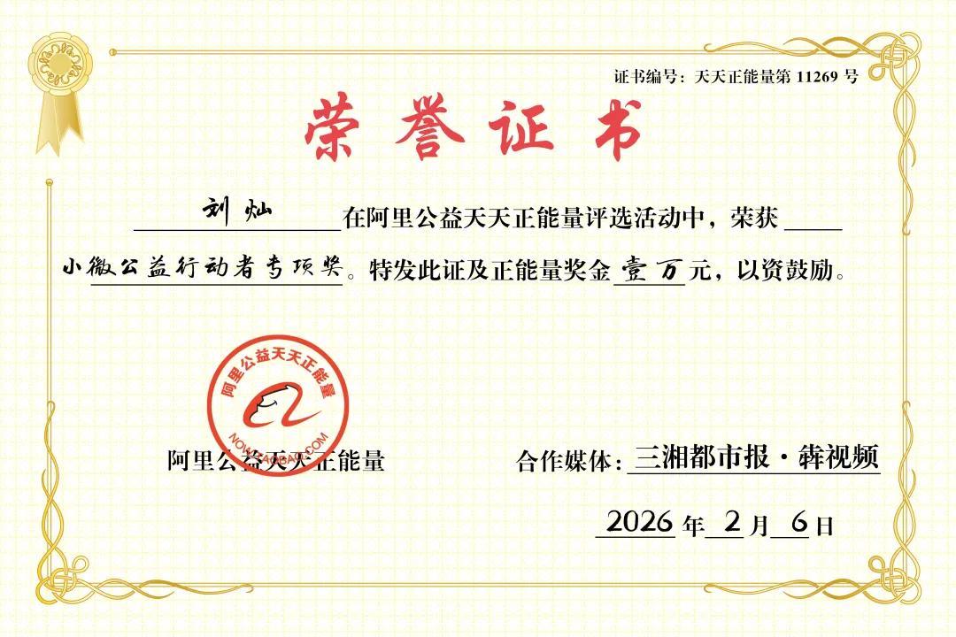 阿里公益天天正能量聯合三湘都市報·犇視頻,爲劉燦頒發小微公益行動者特別獎。