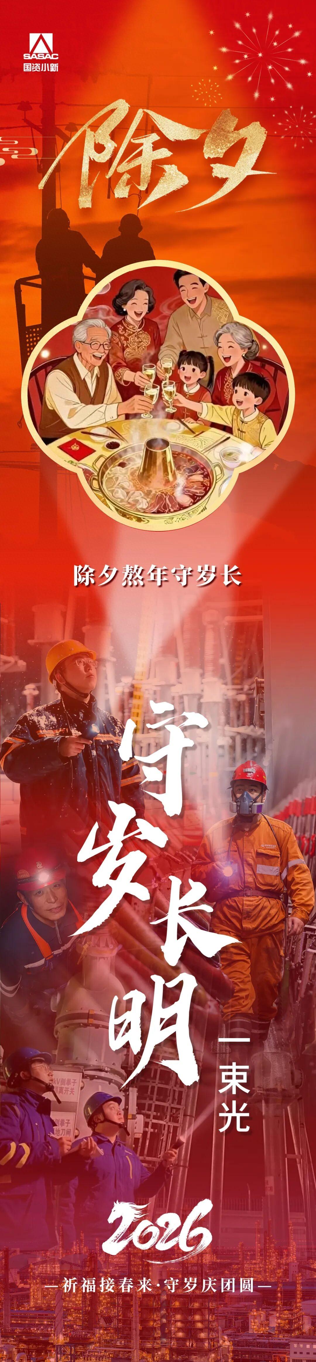 年味兒,是守歲時明亮的燈火,是電話那頭傳來的拜年聲,是千里歸家路上的期待,更是家人團圓的美好……這些延續至今的年俗,共同構成了我們關於新年的記憶。這個春節,小新推出特別策劃“企畫中國年”,從除夕到初七,用專題海報和系列美圖,帶大家一起走進“老年俗”,品味中央企業尖端科技、現代產業、民生服務加持下的“新年味兒”。今天,小新爲您帶來第一篇《守歲長明“一束光”》,看這束光如何穿越山海,點亮萬家燈火,照亮最溫暖的那一寸團圓。