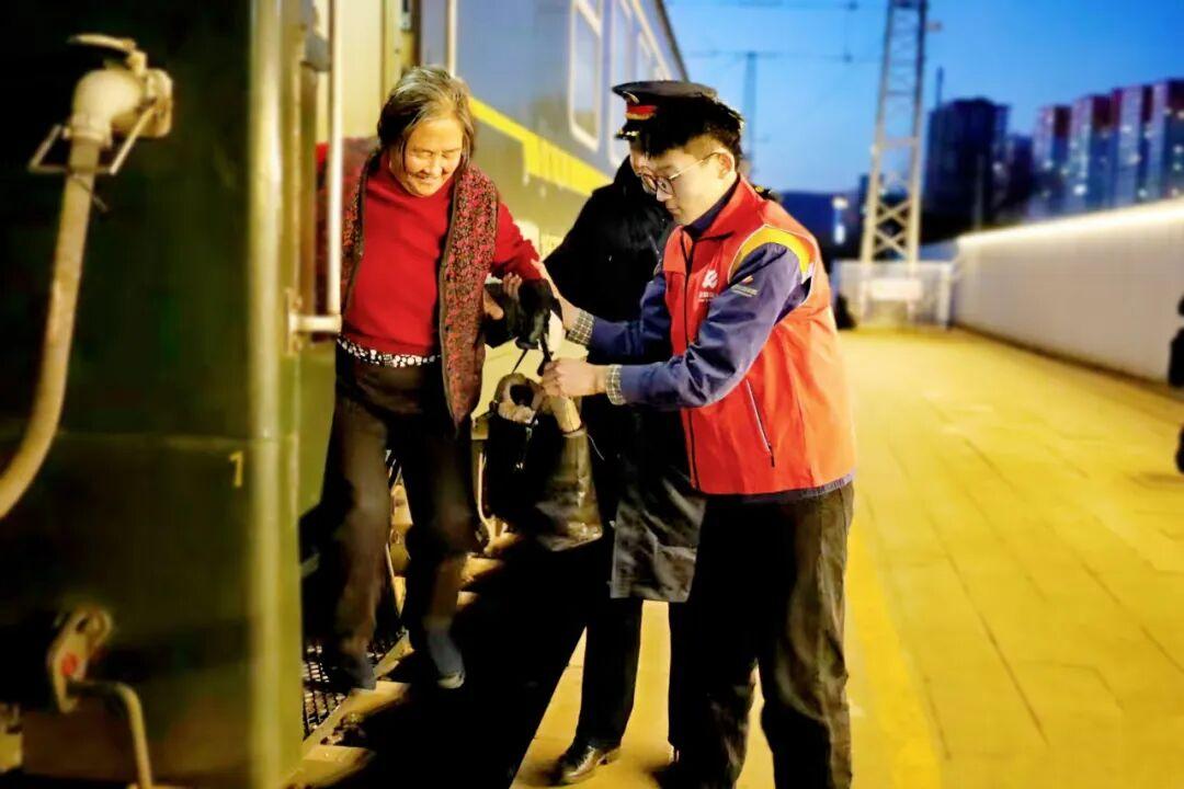 春運夜色裏,青年志願者俯身攙扶,