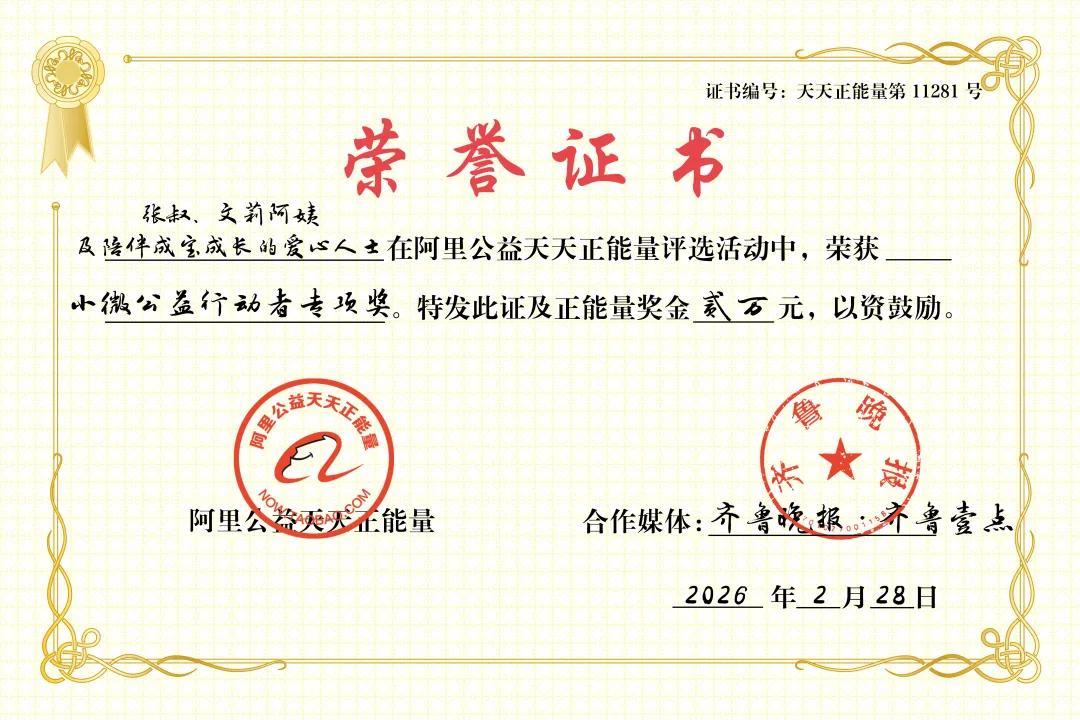 今天,阿里公益天天正能量聯合齊魯晚報·齊魯壹點,用一份小微公益行動者專項獎,致敬張叔、文莉阿姨及一路陪伴成寶成長的每一位愛心人士。