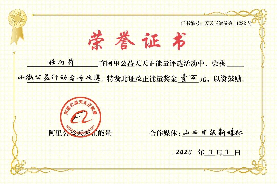 阿里公益天天正能量聯合山西日報新媒體,用一份小微公益行動者專項獎,致敬任向前,致敬那雙拾起人間大愛的手,致敬那顆永遠向前、永遠滾燙的心!