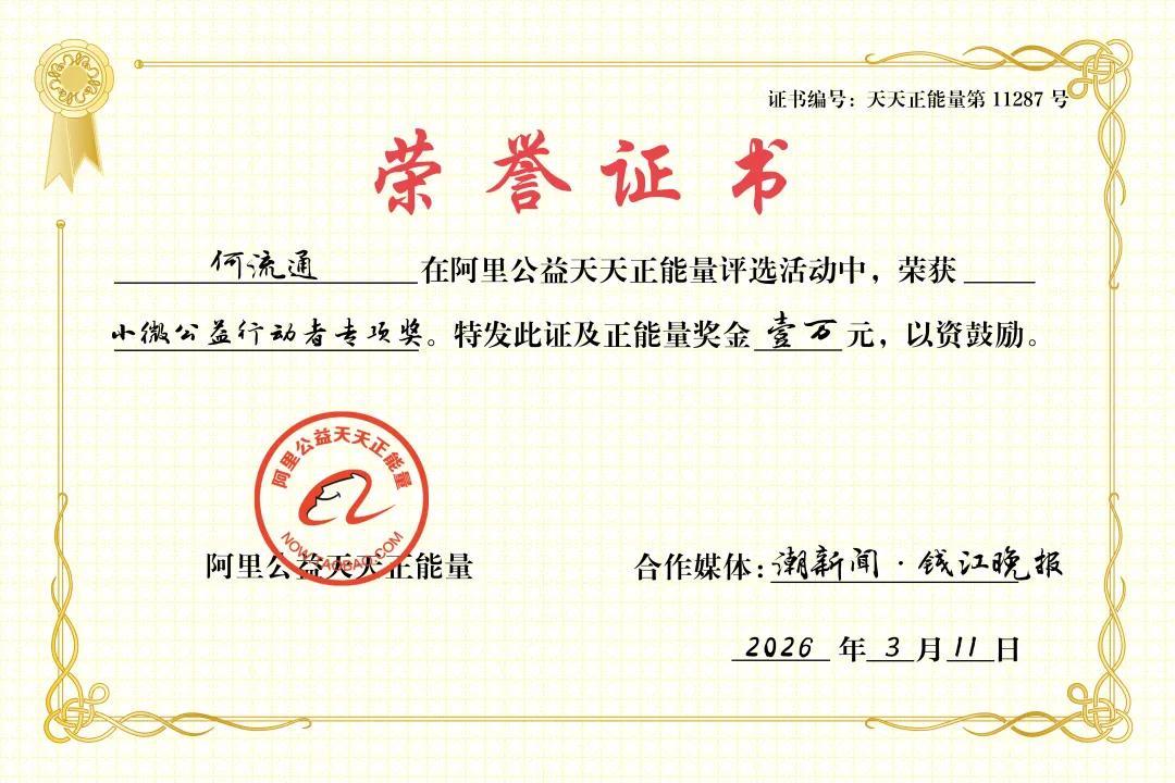 阿里公益天天正能量決定聯合潮新聞·錢江晚報,用一份小微公益行動者專項獎,爲暖心小店店主何流通助力。