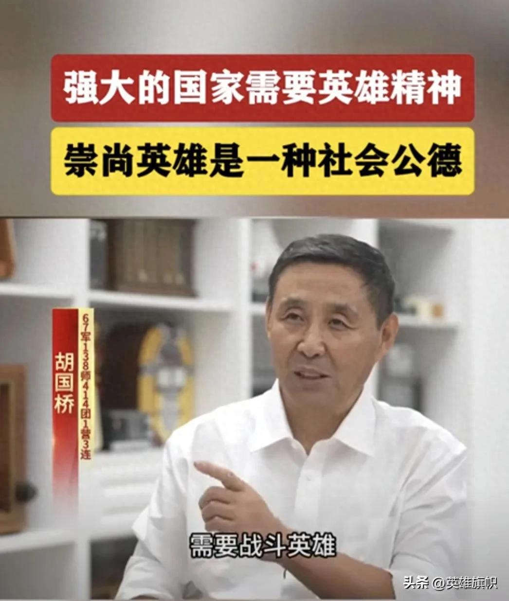胡國橋:中國需要英雄,需要戰鬥英雄。你說咱們部隊靠什麼?靠武器裝備?靠後勤保障?咱們都要比強敵差很多!但是,爲什麼咱們打了勝仗?就是靠這種戰鬥的精神,這種光榮的傳統,這種紅色的基因。英雄啊,是一個民族(精神)最高的一個制高點。英雄不僅是戰鬥英雄,戰場上的英雄,還要延展到各行各業,每個人都要有這種追求和目標,不是說都去打仗。崇尚英雄,實際上是一種人生正確的價值觀,是一種社會價值的導向。英雄包括犧牲,包括奮鬥,包括奉獻,先人後己,這些美德可以轉化成一種特別好的社會功德。(崇尚)英雄實際上也是在弘揚社會功德,這是一個國家的一個基本準則。