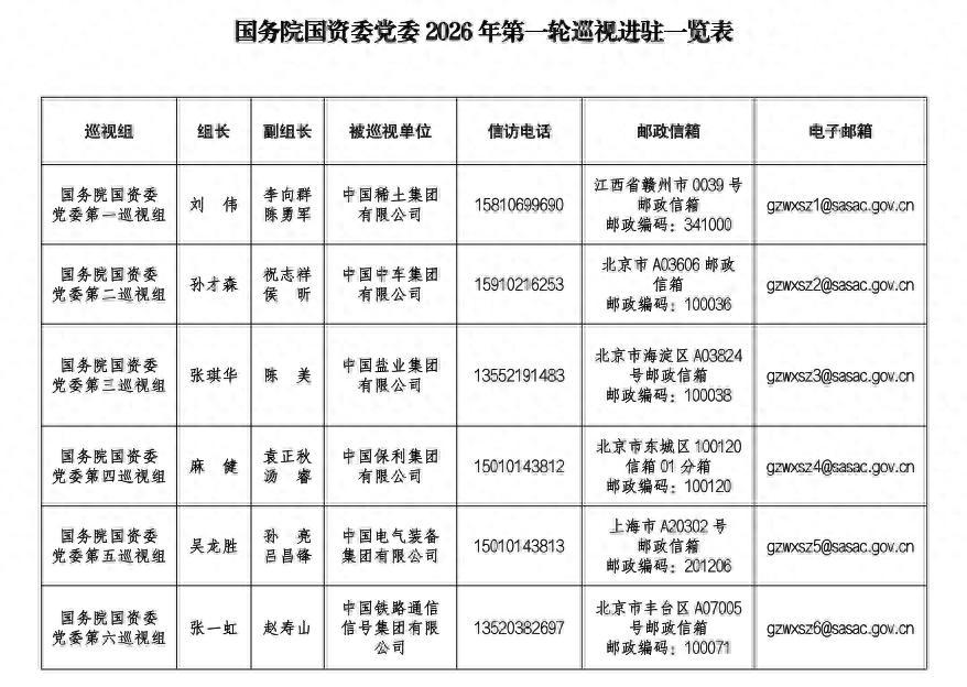 按照國務院國資委黨委和巡視工作領導小組部署安排,截至2026年4月10日,國務院國資委黨委2026年第一輪巡視完成進駐工作。國務院國資委黨委6個巡視組將對中國鹽業集團有限公司、中國稀土集團有限公司、中國中車集團有限公司、中國鐵路通信信號集團有限公司、中國保利集團有限公司、中國電氣裝備集團有限公司等6家企業黨委開展常規巡視。