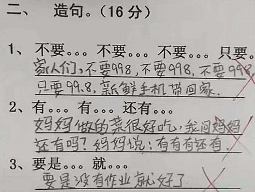 造句,這熊孩子的造句,真的是一言難盡啊!廣告都出來了,還一不小心說出了“要是沒有作業就好了”的心聲。