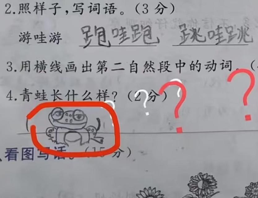 讓描述一下青蛙什麼樣,好傢伙,這孩子直接把青蛙給畫上去了!