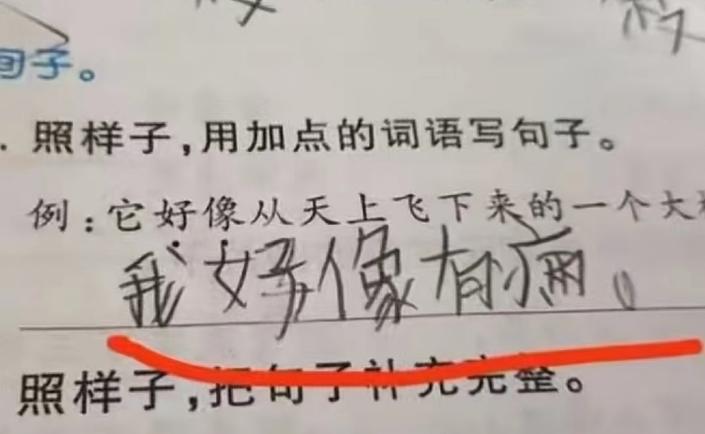 照樣子,用加點的詞語寫句子,這本就是一個“造句”的問題,孩子的答案竟然是:“我好像有病。”