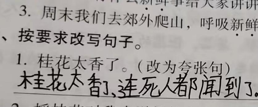 將“桂花太香了”改爲誇張句,然後,孩子改成了“桂花太香了,連死人都聞到了”。