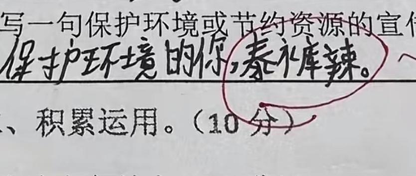 考試題目讓孩子寫一句保護環境或者節約資源的宣傳語,然後孩子寫了一句:“保護環境的你,泰褲辣!”