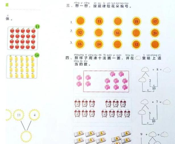 比如家長孩子都有點繞的湊十法、借十法等,這裏面的練習題,都用圖解的方式,讓孩子快速理解並學會應用。