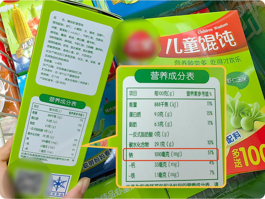 還有的兒童餛飩,鈉含量更是驚人!算上蔬菜包、湯料包,每 100g 裏鈉含量高達 1010mg!