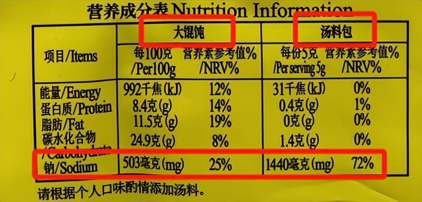 像上面這個,100g 餛飩纔有 503mg 鈉,但 5g 湯料包里居然有 1440mg 鈉!這個含量簡直高的嚇人!
