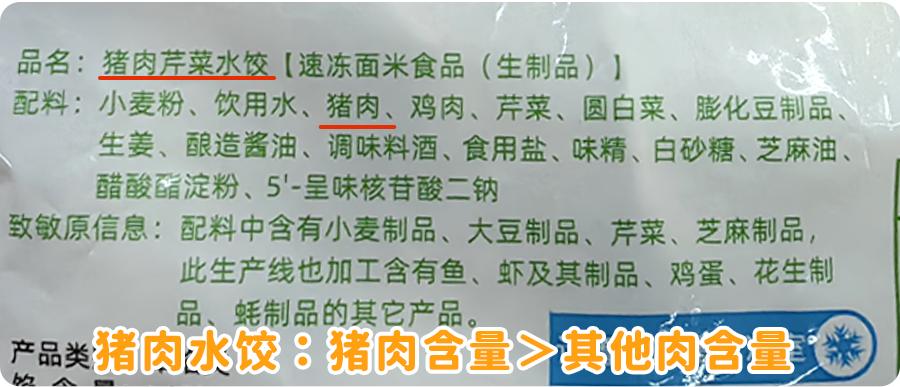 舉個例子,如果是豬肉芹菜水餃,那配料裏豬肉的含量不應少於其他肉類。直白講,豬肉要靠前出現,才稱得上“真豬肉水餃”。