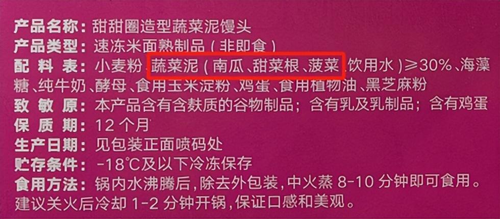 從配料表裏也能看出,會有一些天然帶顏色的蔬菜泥,比如下面這個饅頭裏有南瓜(黃色)、菠菜(綠色)
