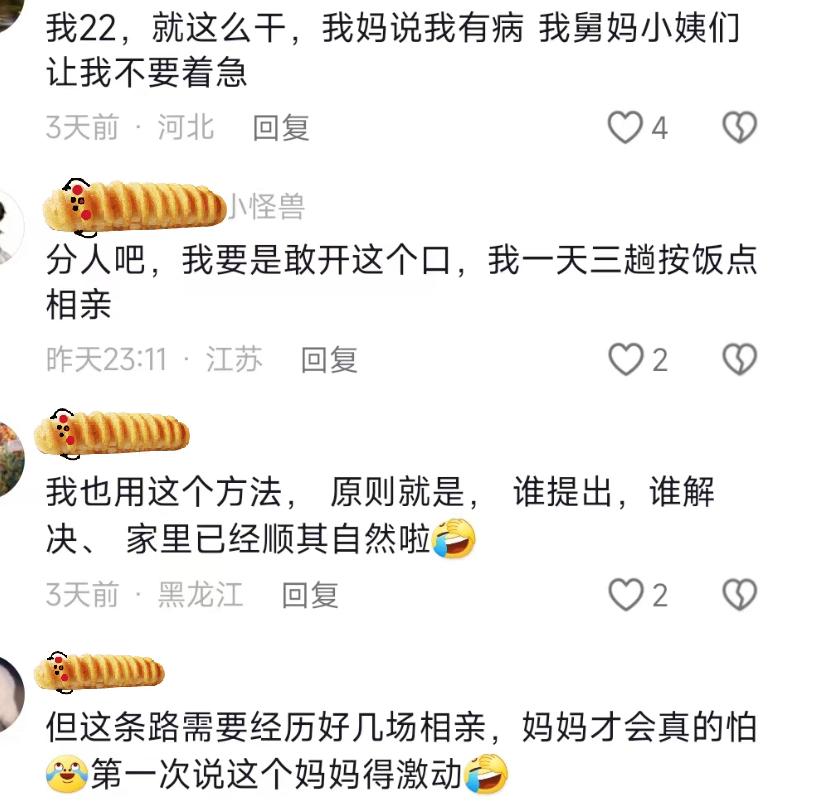 網友E表示:自己用了這樣“反向催婚”的辦法之後,現在家裏人已經順其自然了。